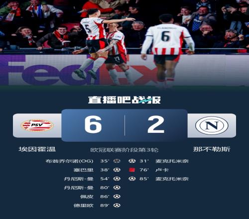 体育播报10月22日宣 欧冠联赛阶段第三轮比赛,那不勒斯客场2-6不敌埃因霍温。